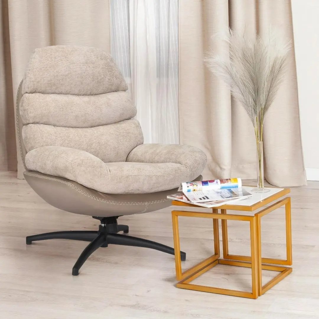 Brațele comode și forma bine gândită a spătarului oferă un suport bun pentru spate și confort în timpul cititului, vizionării televizorului sau pur și simplu relaxării. Construcția solidă garantează durabilitate la utilizare zilnică. Culoarea bej adaugă căldură și lumină în cameră, iar accentele negre conferă sobrietate și eleganță.