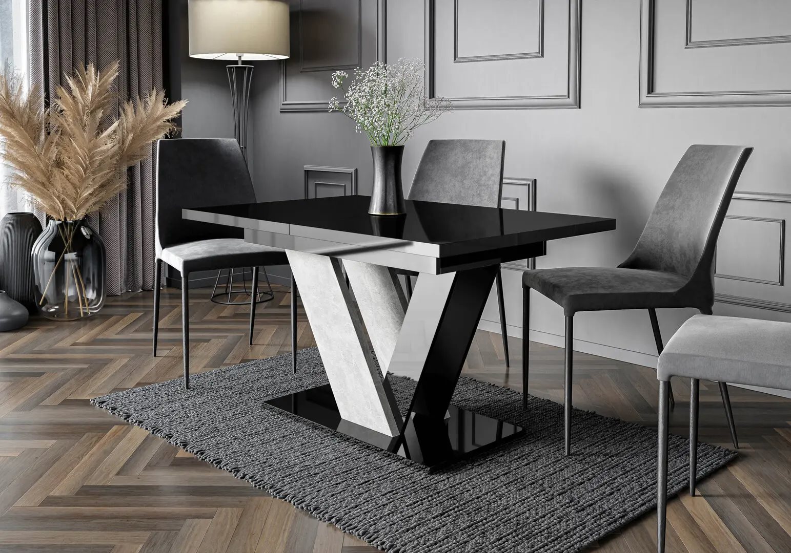 Masa extensibilă Prospero Dubaj (Black Gloss/Stone) de cumpărat în Moldova este exact masa extensibilă cu blat lucios negru și textură Stone pe care o căutați. Negrul lucios profund în combinație cu textura de piatră arată scump, modern și stilat.