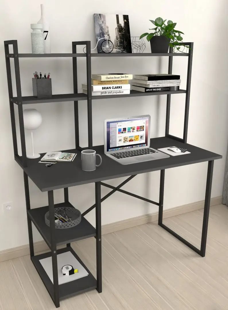 Biroul Bofigo cu etajeră Anthracite/Black de cumpărat în Moldova este un birou funcțional cu etajeră superioară suplimentară pentru organizarea spațiului de lucru. Blatul generos de 120×60 cm oferă un loc comod pentru monitor, laptop și documente, iar etajera cu rafturi deschise este ideală pentru cărți, dosare și decorațiuni.
