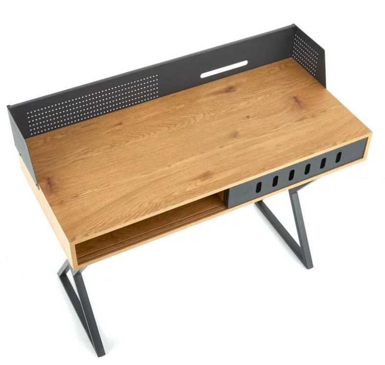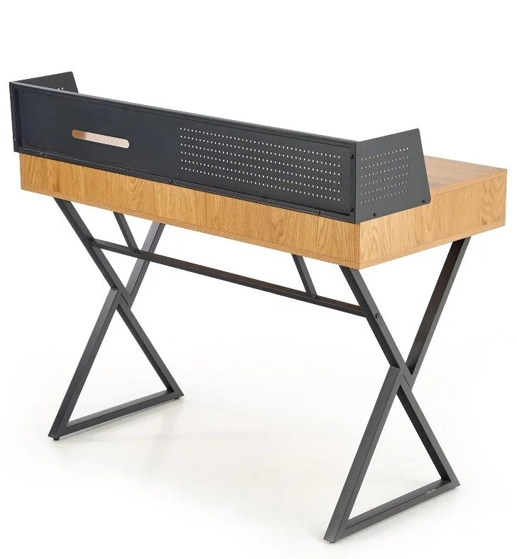 Biroul de calculator creativ și modern Halmar B-43 este potrivit atât pentru uz casnic, cât și pentru birou. Blatul mesei este din MDF, cadrul robust este din metal vopsit negru.