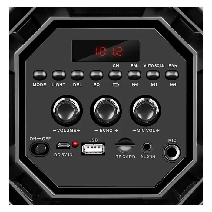 Dispozitivul este echipat cu iluminare multi-color ce creează o atmosferă festivă și susține dinamica vizuală a sunetului. Afișajul LED indică modul de funcționare și setările curente.