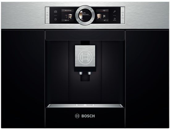 Встраиваемая кофемашина Bosch CTL 636 ES1 выпускается в двух цветах серебристый и чёрный. Верхняя светлая планка в серебристой модели выполнена из шлифованного металла. Центральный круг для управления меню так же металлический. Чёрные детали из пластика. Вся панель управления сенсорная и выполнена из стекла. Два цветных дисплея разделены вращающейся шайбой управления.