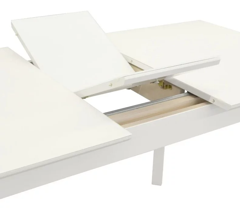 Стол с деревянными ножками и каркасом из окрашенного МДФ, нижняя поверхность из шпонированного МДФ, покрытая закаленным (термически обработанным) стеклом толщиной 4 мм. Размер стола легко регулируется по длине в соответствии с потребностями, таким образом расширение позволяет разместить за столом от 4 до 6 человек. Раздвижные столы высоко ценятся благодаря высокопроизводительной системе, основанной на скользящем механизме выдвижения столешниц, поэтому одной рукой стол может быть выдвинут автоматически.