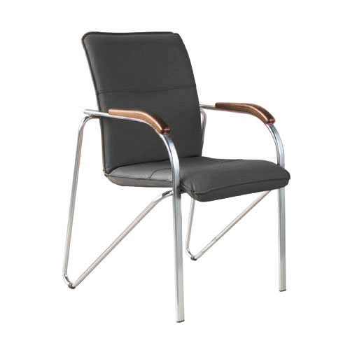 Стул Samba с мягкими сидением и спинкой, хромированной рамой и деревянными накладками на подлокотниках.